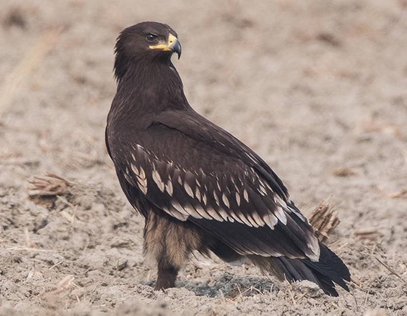 Burung rajawali totol memiliki bulu berwarna cokelat gelap yang terlihat hitam dari jarak jauh. Sayapnya panjang dan lebar, sedangkan ekornya pendek. Secara keseluruhan, bentuknya mirip dengan elang stepa meskipun ukurannya sedikit lebih kecil.