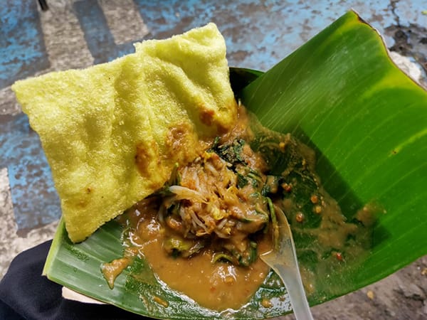 Daun semanggi dan tauge disiram saus yang terbuat dari campuran kacang dan ubi jalar, dengan rasa manis dan sedikit pedas, disantap pakai kerupuk puli.