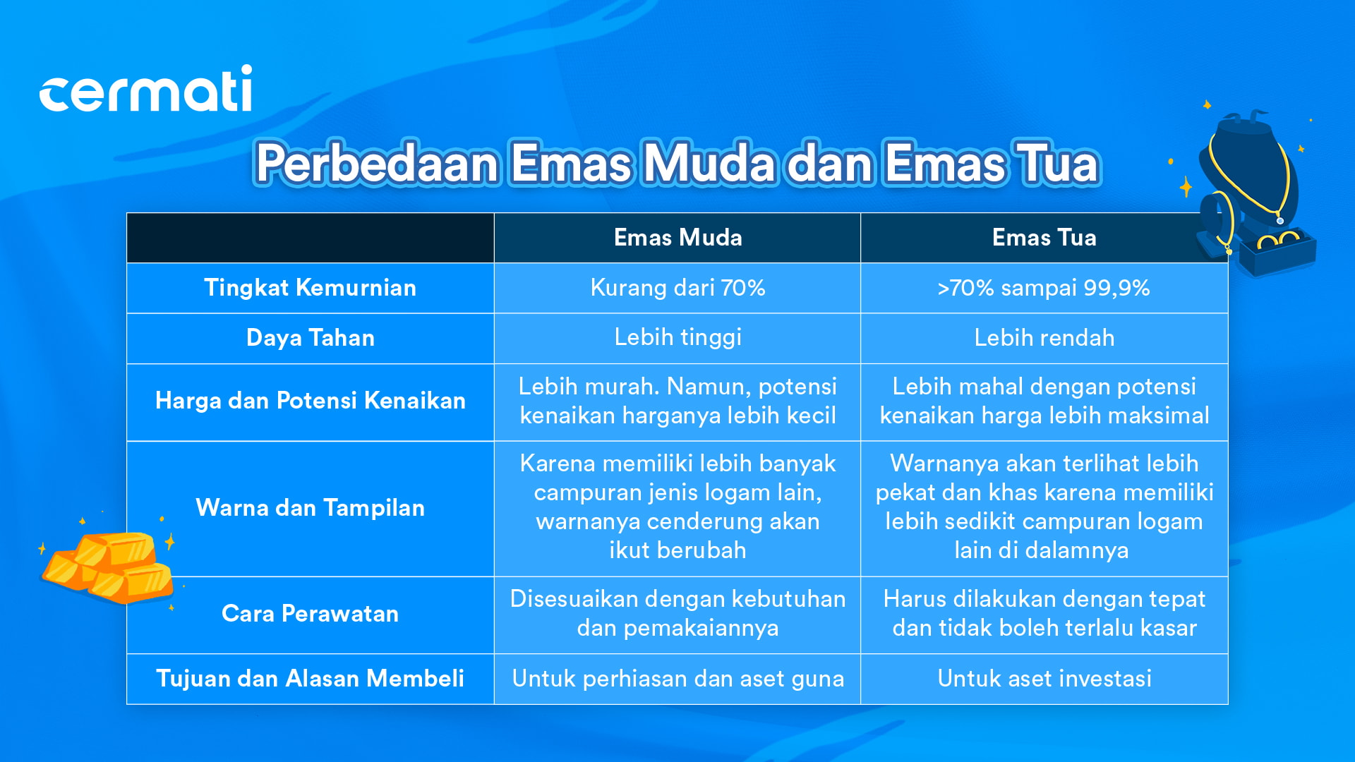 Meskipun keduanya memiliki dasar bahan logam mulia yang sama, emas muda dan emas tua memiliki beberapa perbedaan penting yang perlu dipahami sebelum membelinya. Dengan harga yang lebih murah dan ketahanan yang baik, emas muda cocok digunakan sebagai perhiasan, sedangkan emas tua dengan kadar karat yang tinggi lebih ideal sebagai bentuk investasi. Setelah mengetahui perbedaan antara emas muda dan emas tua di atas, sesuaikan dengan kebutuhan Anda dan hindari kesalahan dalam memilih.