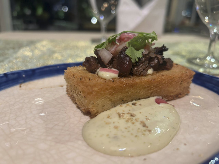 Salah satu hidangan yang paling menarik perhatian adalah bola kentang manis, yang dibuat dari campuran kentang manis, cakalang rendang asap, dan saus sambal hijau aioli.