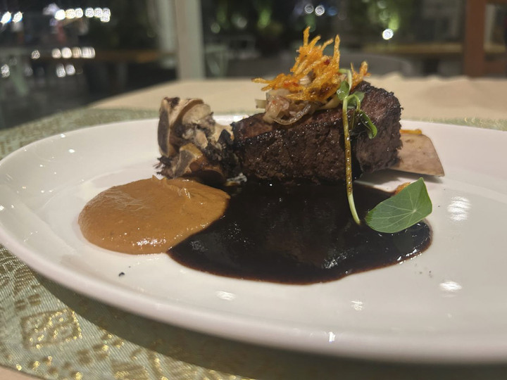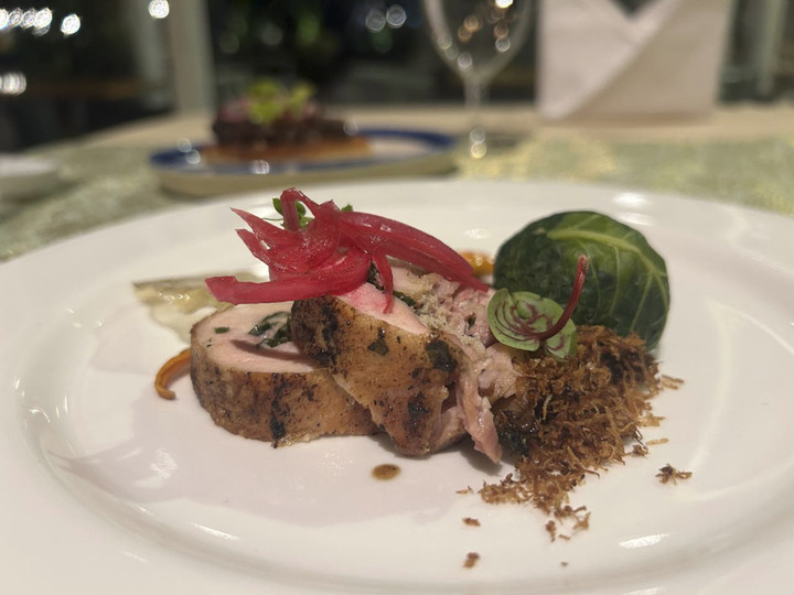Kemudian ada rolade ayam dengan bumbu Batak, olahan ayam yang kaya akan rempah khas Sumatera Utara, diikuti oleh mangut barramundi, hidangan ikan yang menyajikan kehangatan rasa tradisional.